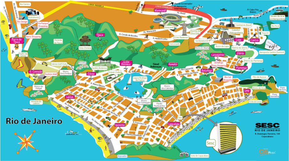 Mapa Ilustrado e personalizado, mostrando de uma forma lúdica a localização do hotel e uma visão geral da cidade do Rio de Janeiro.